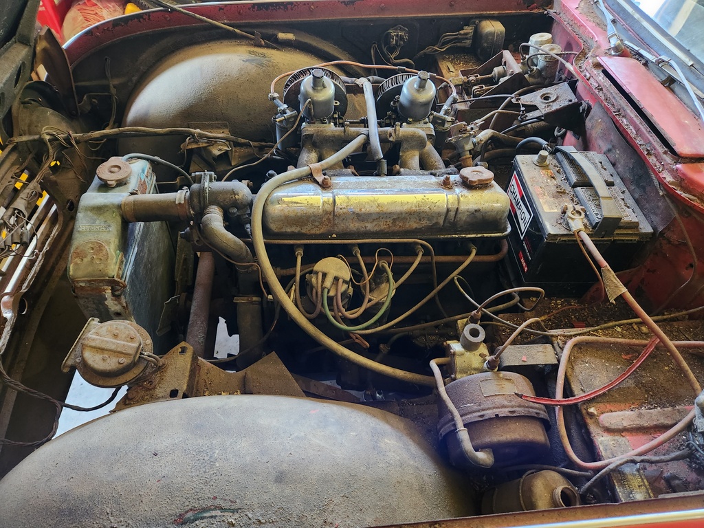 A cursory glance indicates it had some rough times in its early life and was rebuilt with parts from a TR4A and a TR5. The engine is a later TR4A vintage, and an overdrive was installed at some point along the way.